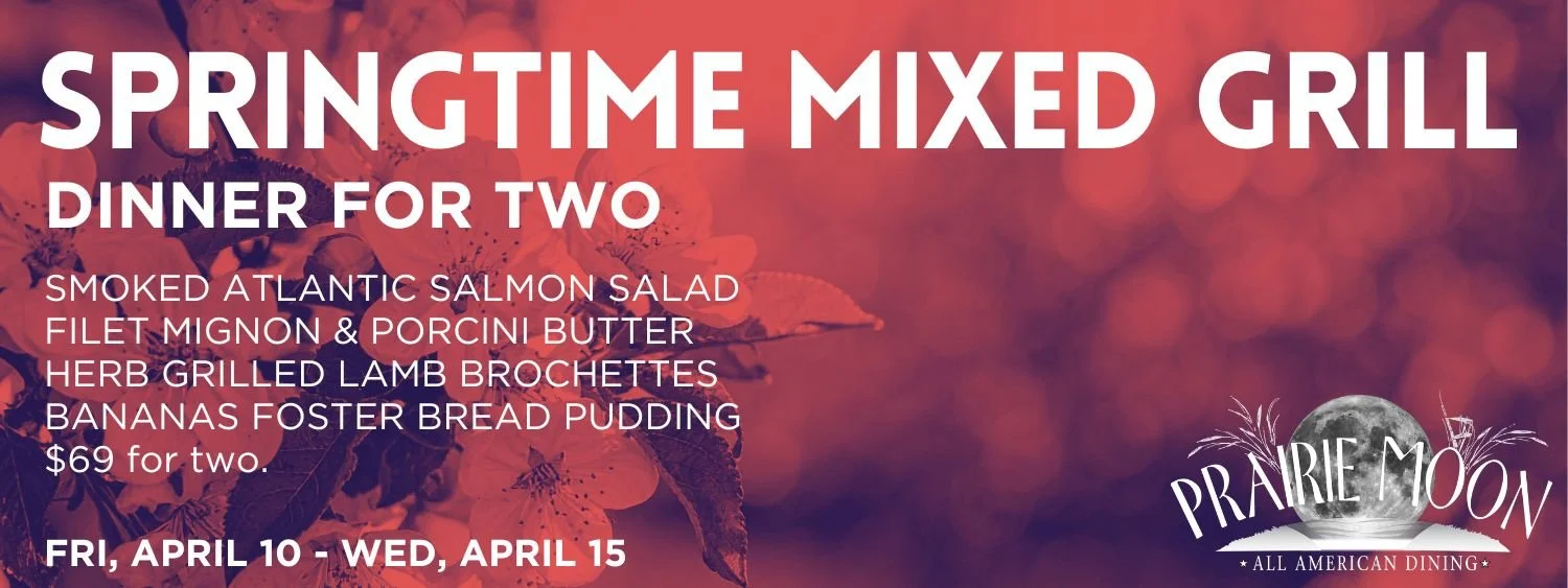 Each week, Prairie Moon takes you on a culinary adventure to a different flavor capital of the country. Includes an appetizer, two entreé specials, buttercrumb bread, and a dessert. The pre-fixe dinner for two is announced each Thursday and available Fridays-Wednesdays